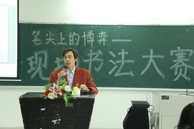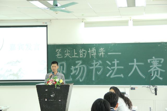 本次书法比赛以“雨”为主题,伴随着《雨下一整晚》的婉转旋律,邓思清老师上台致开幕词,希望本次比赛以“传承文化,交流艺术”为要旨,相互切磋,共同进步。本次决赛分软笔和硬笔两个比赛组,采用选手现场创作,评委当场评分的形式。当比赛信号发起,同学们开始软、硬笔的现场作品创作,挥毫笔墨宣纸,写意风云变态。有篆书的古朴沉郁,有楷书的端庄雅肃,有行书的龙蛇灰线,有草书的“翩若惊鸿,婉若游龙”。在硬笔书法一面,通常认为难以表达书法之笔锋走势的签字笔到了选手手中亦自不凡,点铁成金,妙手生花。转换平和自然,落笔签章浑然一体,充分显示书写者的书法基础,虽无大开大合之势,亦有跃然纸间之美。期间还有互动问答环节,尽显宾主同台共享之态。在点评环节,邓海涛老师首先对三个理工科学院举办书法比赛表示充分肯定,理工科学生中卧虎藏龙,令其欣慰,邓老师针对本次比赛中的书法之道——执笔之法、字法构造、章法艺术等方面做出即时点评,并分享了一些书法经验,鼓励选手尝试多种书体,强调了选手把握现场发挥技巧及用心态赢取比赛的重要性。