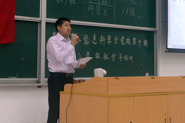 一开始,冯老师为我们分析了《中国共产党章程》的总纲,继而通过翔实的历史资料讲解了党的发展进程:党的建立,党经历过的艰辛与挫折,党的辉煌与胜利,以及党在成长过程中所积累的正反两方面的经验。冯老师还跟大家分享自己的亲身体会,描述其心中党的形象,不断地与学生们沟通、互动。其后,曾书记作了一番重要讲话,从“入党动机是什么?” “为什么要端正入党动机”?“如何端正入党动机?”“以实际行动争取早日入党”四个方面要求同学们作好入党准备,让同学们树立起正确的入党动机,为提高学生党员素质奠定了基础。