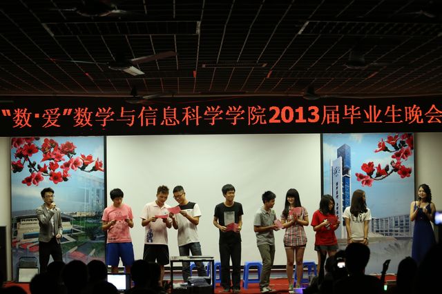 在图书馆一楼讲学厅举行“数•爱”2013届毕业生欢送晚会,院党委副书记曾学毛老师、09(3)班班主任王迎占老师、学工办主任高菲老师、团委书记杜亚辉老师均出席了本次晚会,2013届毕业生共聚一堂,享受着这欢歌盛宴,现场洋溢着浓浓的师生情和数院人满满的爱。