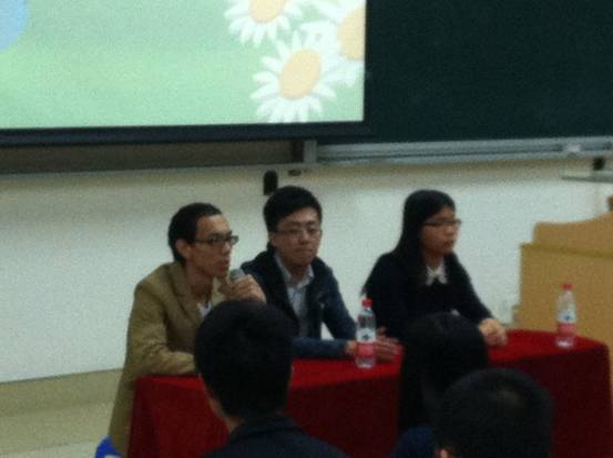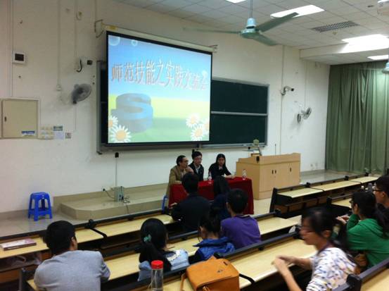 师范技能实践交流会在文新206顺利举行。2009级的罗绍鹏、陈聪以及潘燕霞担任了此次交流会的嘉宾,罗绍鹏同学在其母校番禺南村中学支教,陈聪同学在其母校广东实验中学初中部实习,潘燕霞同学在从化太平中学支教,他们来现身说法,言传身教,吸引了众多对提高师范技能感兴趣的同学的参与。