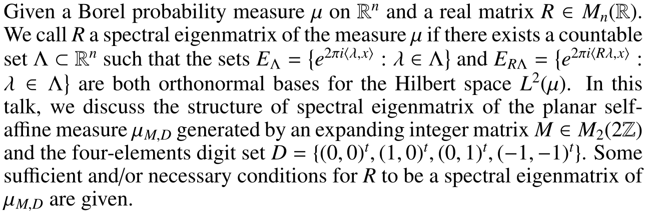 报告人简介:刘竟成,湖南师范大学教授,博士生导师,湖南省杰出青年基金获得者。主要从事分形几何与复分析以及调和分析交叉领域的相关研究,在Adv. Math., J. Funct. Anal.,Appl. Comput. Harmon. Anal.,Nonlinearity等期刊发表学术论文30余篇。在研主持国家自然科学基金面上项目1项,参与国家自然科学基金重点项目1项。