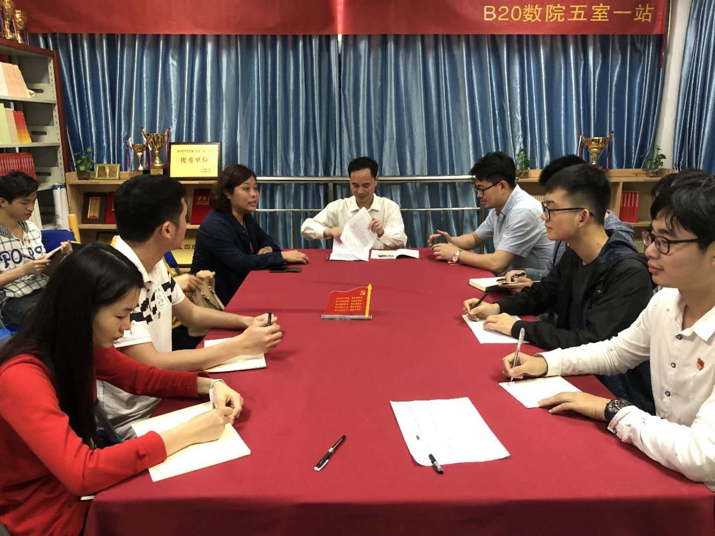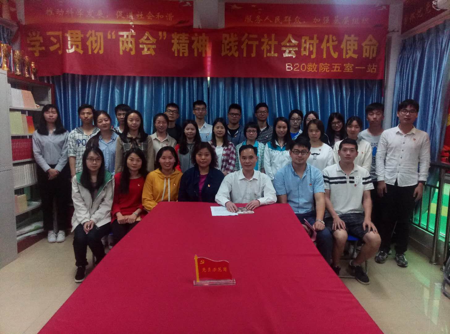 B20五室一站开展了主题为“学习贯彻两会精神,践行社会时代使命”。参加本次学习活动的有学院党委书记黄志凯、党委副书记孙凌、学工办主任张昭、团委书记何惠燕以及数院15-16-17级学生党员、B20宿舍党小组成员。