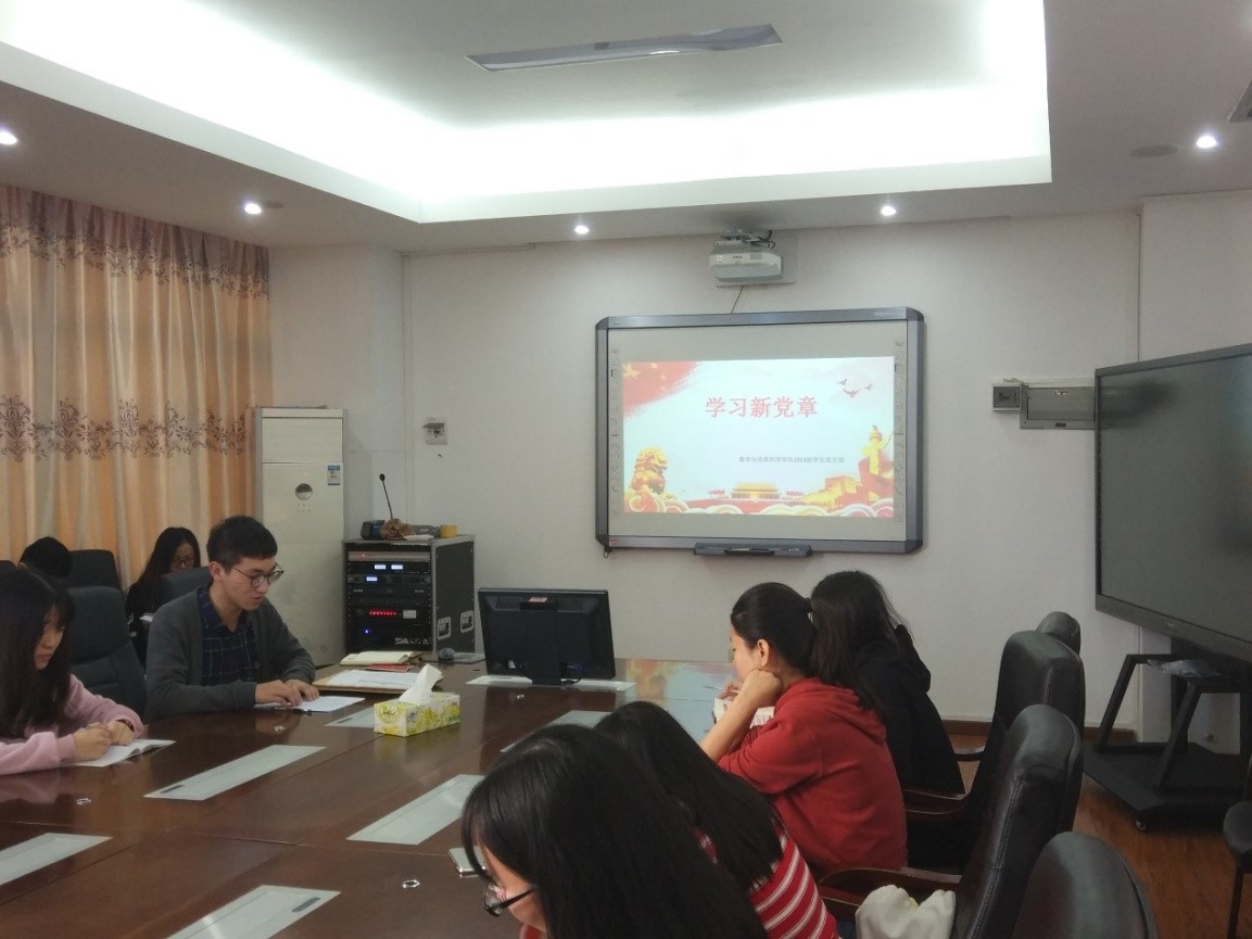 会议伊始,主持人介绍莅临本次民主生活会的领导周展副院长,并说明会议主题和内容,要求大家认真学习思考积极发言。接下来由部分党员同志分享学习感言。颜启豪同志结合自身经历谈到,通过学习新党章更加深刻地了解到我党不论站在什么时代始终坚持为人民服务的宗旨,始终为了中华民族的伟大复兴不懈努力,我们年轻的党员同志也要立身岗位努力为中国梦的实现贡献自己的力量。蔡佳宜同志就新党章中“文化自信”说到,在全球文化大融合现代网络高度发展的今天,作为青年一代的我们要坚定中华民族的优秀传统文化,理性面对西方文化的渐染,自觉抵制不良文化的侵蚀,树立本民族的文化自信。李博闫同志对写入新党章的“绿水青山就是金山银山”发表了深刻的见解,同时结合校园里的卫生情况提出了建议。最后,由周展副院长发言,他对各位学习小组的发言给予了高度评价,在强调要认真仔细地学习党章的同时叮嘱各位党员同志要将理论与实践相结合,用新时代新党章的新思想指导日常的学习工作和生活,要始终坚定不移地跟着党的脚步,在新时代中国特色社会主义建设的道路上发光发热。