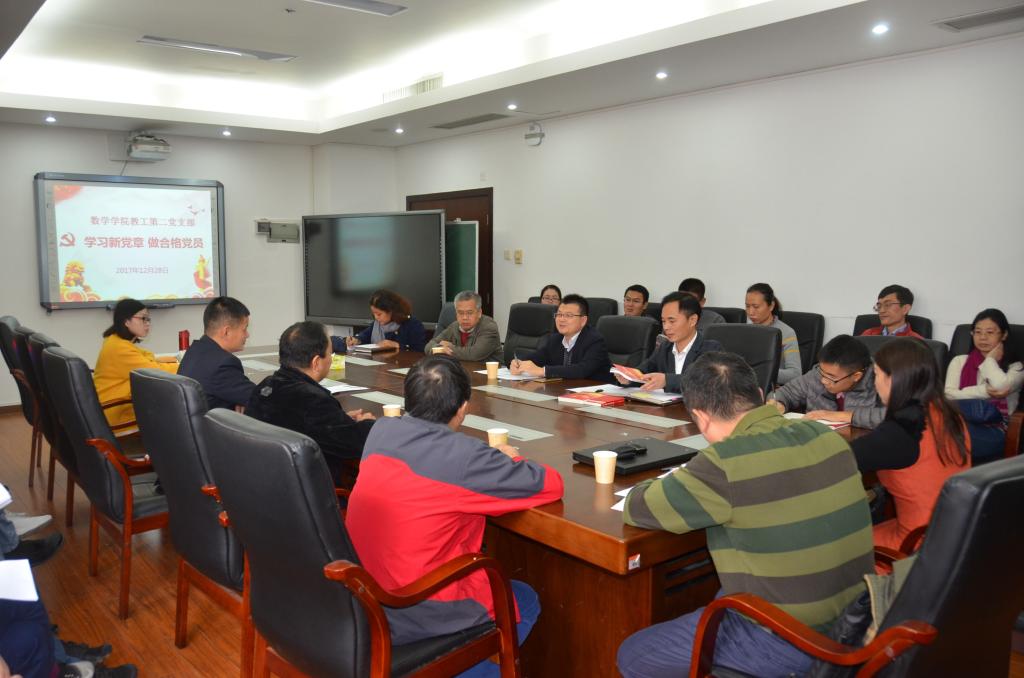 会上,傅继阳副校长以普通党员的身份谈了学习新党章的体会,并对支部建设、“两学一做”等提出了要求。他指出党章是党的根本大法,是全党必须遵循的总规矩,根据新形势新任务对党章进行修改,把党的重大理论成果和战略思想写入党章,有利于党中央进一步凝心聚力,带领全党全国人民不断开创中国特色社会主义新局面,对实现“两个一百年”奋斗目标和中华民族伟大复兴中国梦,具有深远而重大的意义。他提出教师党员要把学习十九大报告和学习新党章与自己的实际工作充分结合,在学习中要做到“真学”、“真懂”、“真信”、“真用”,要能理论联系实际,真正指导我们学校目前的高水平大学建设。他希望每一位教师党员都能加强理论学习,把党和国家的政治思想、政治主张内化为自己学习和工作的内驱力。十九大提出要加强基础研究,数学作为最基础的学科,学校寄予了厚望,希望在提升基础学科建设方面能够积极面临对挑战,在高水平大学建设中做出更加突出的贡献。