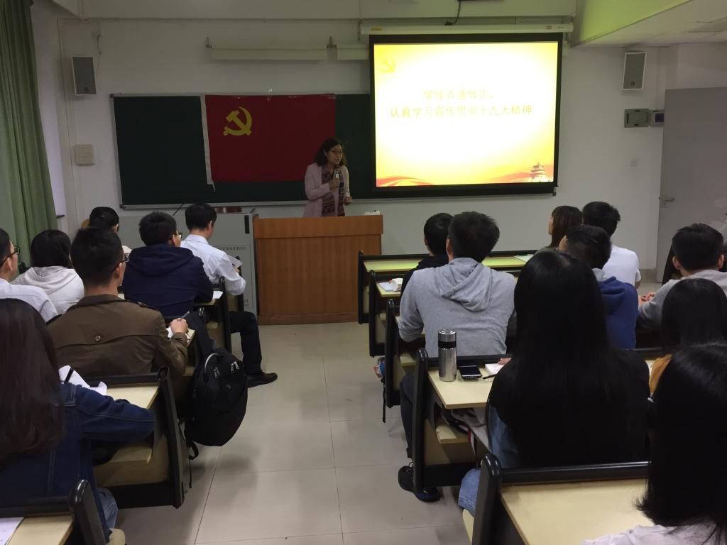 11月7日,学院党委书记黄志凯和副书记孙凌分别向来到学生党支部,面向全体学生党员进行十九大精神的宣讲。黄书记通过介绍“十九大关键词”对十九大精神进行条分缕析。学习中黄书记对学院全体学生党员提出要求,希望同学们能够在学习上树立模范带头作用,志存高远。党委孙凌副书记则向学生党员做了新党章修改的13个要点的解读,号召同学们认真学习,以党章作为自己的行动指南。最后,在黄书记领誓下,全体学生党员同志举起右拳,庄严宣誓,重温了入党誓词:不忘初心,牢记使命!