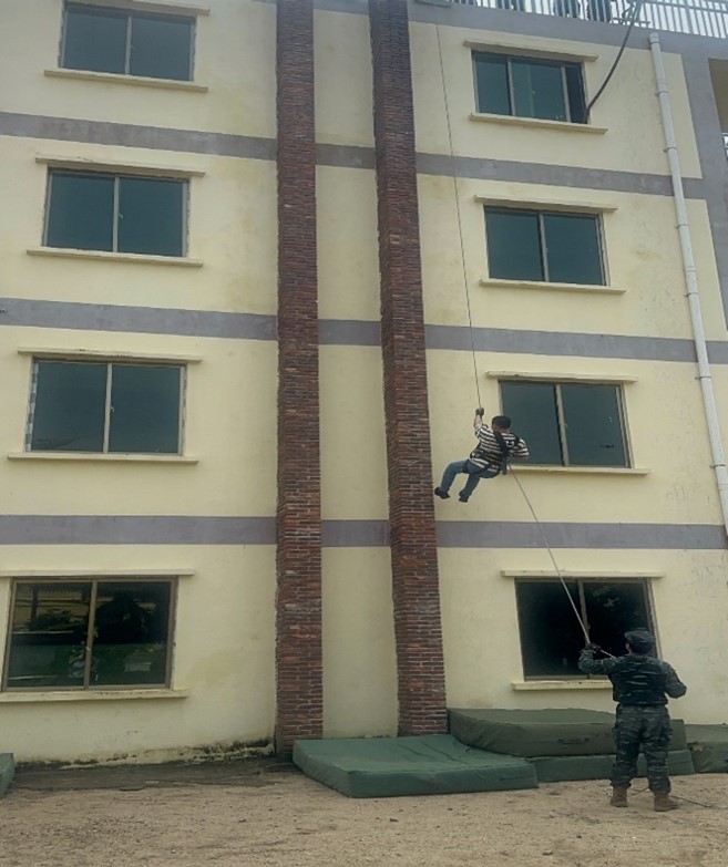 部队相关负责同志介绍了部队基础设施建设情况,带领大家参观了部队营区环境,观摩部队训练科目和反恐技能演示及部分特色装备实物展,并指导参观老师现场体验高空侦察攀沿。