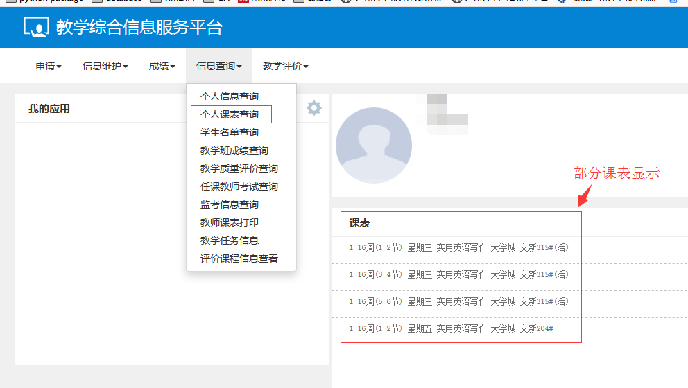 2、:教师查询个人课表。教师登录系统后,在系统主页上可显示部分课表,图K-1所示(若教师承担的教学任务多,该处有可能显示不全),