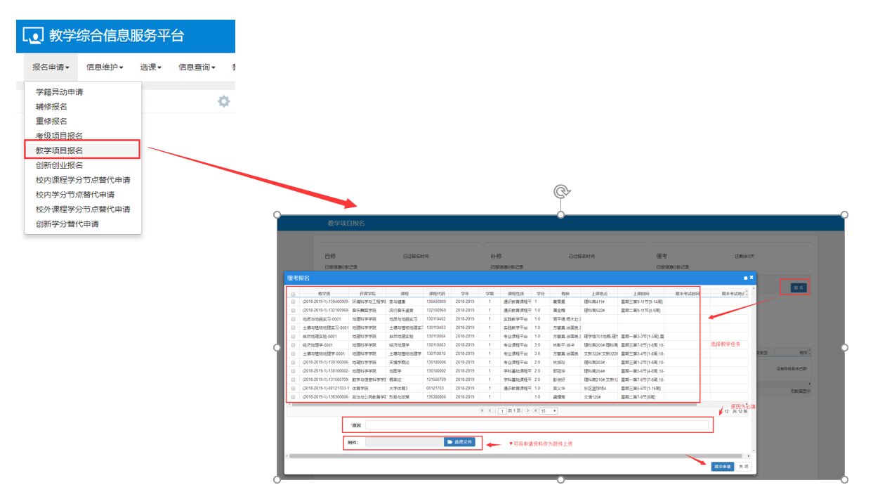 说明:1)选择需要缓考的教学任务时,务必要选择准确,一旦通过终审原则上不予撤销;2)申请原因为必填;3)可将申请资料作为附件上传。