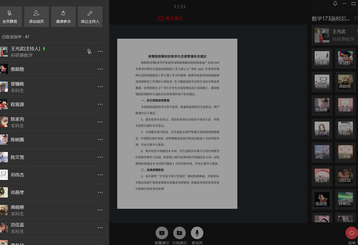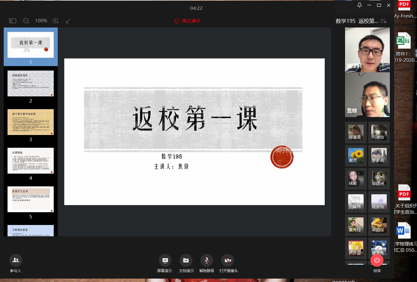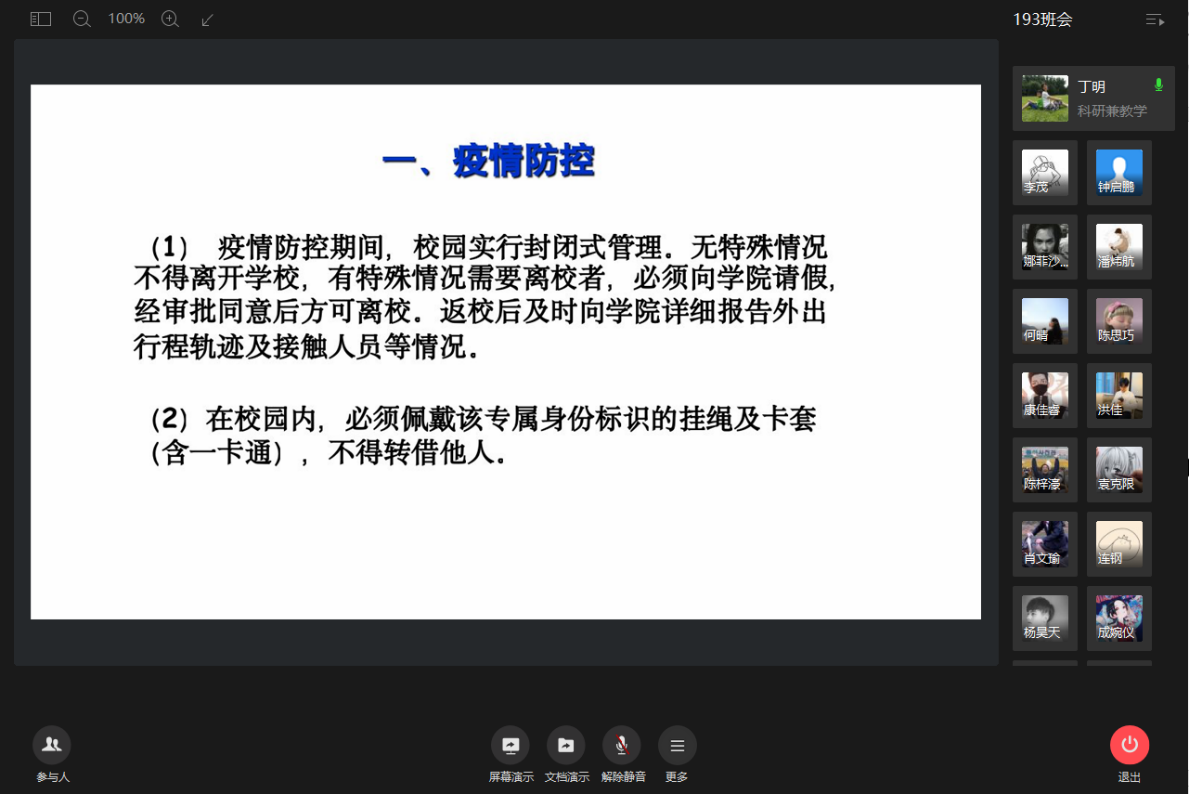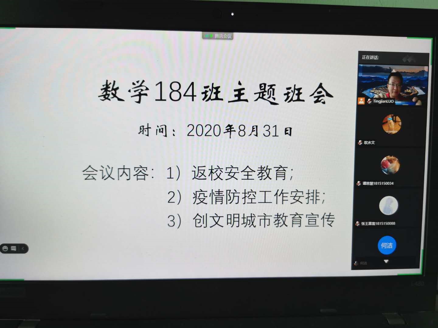 各年级各班开展了“返校第一课”,由各班班主任向班级同学主持并传达疫情防控知识、线下教学和考试纪律、心理调适、安全教育和人文关怀。其中,数学学院副院长钟育彬教授参加了数学192班班会,他指出,返校复学不放松,一方面提醒同学严格遵守校园规定,把疫情防控常态化工作的责任放在心上、担在肩上、抓在手上、落在实上,另一方面关心同学们的返校心情,提点同学们尽快调整好学习状态,以新面貌投入校园学习生活。学院为同学们安排了研究生答疑辅导和任课教师复习课指导,希望同学们努力备考,尽快适应返校后的生活与作息。