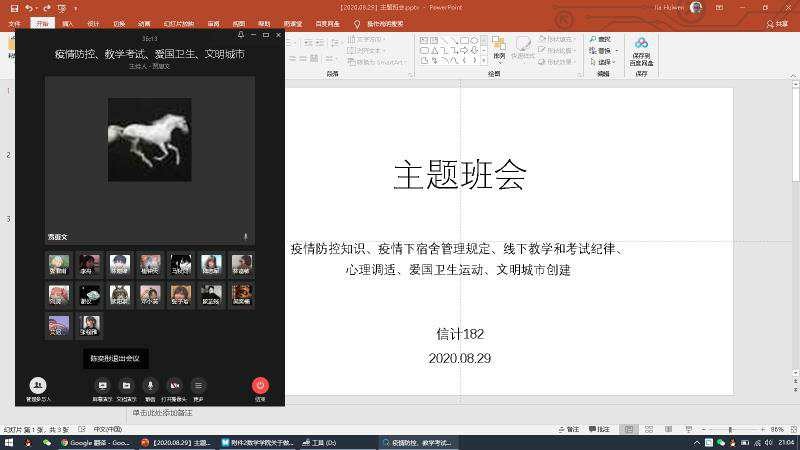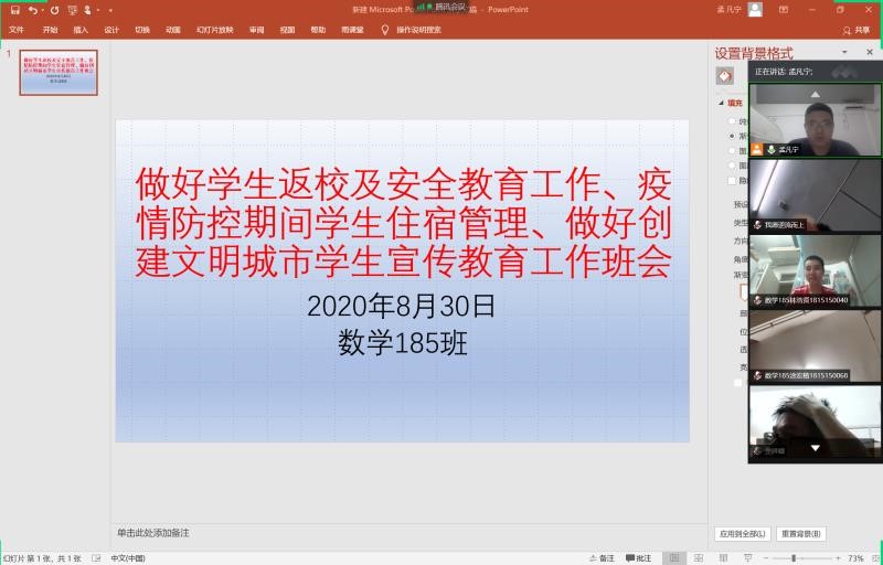 数学学院副院长蒲学科教授参加了数学195班的班会,他提醒同学们要遵规守纪、加强防范,筑牢群防群治的基石,通过劳动教育和爱国卫生运动传播疫情防控的正能量。希望同学们加强自律,制定好学习计划,冲刺考试。努力学习专业知识,练就过硬本领,自觉加强思想政治修养,厚植爱国主义情怀,以“五有”精神砥砺成才。班主任焦峰老师在班会上提醒学生严格遵守学校有关的防疫规定,认真对待晨午检、宿舍消毒通风、养成良好作息,做好环境卫生的整洁,自觉维护校园的安全卫生健康环境。