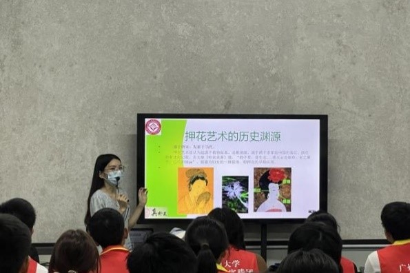 第四站是进行非遗岭南押花技艺学习及创作,同学们在听完授课老师对非遗岭南押花技艺的背景、特点、价值、制作的基本步骤以及注意事项的讲解后,通过自己天马行空的想象开始了自己押花之旅,用自己灵巧的双手制作出属于自己的作品,并向同学们介绍了自己的作品。