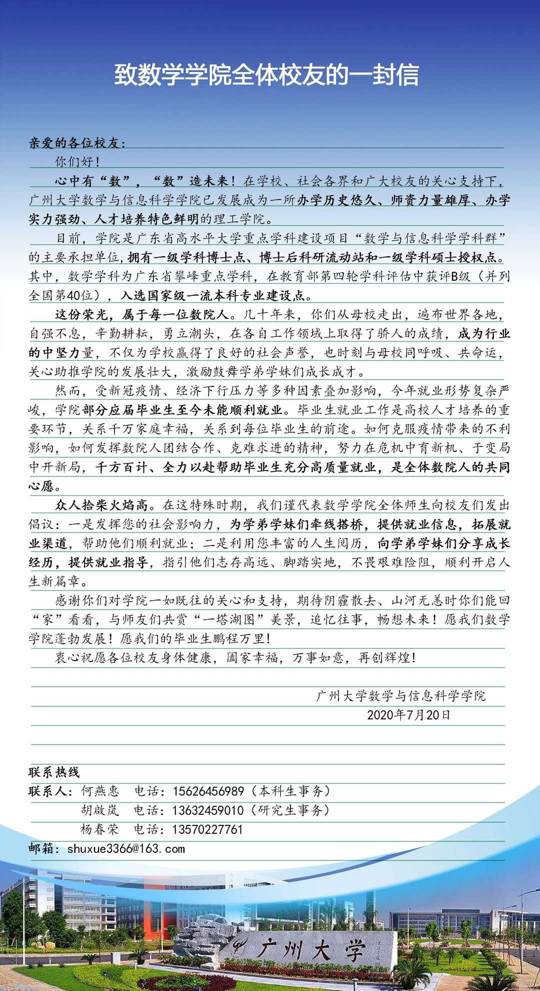 众人拾柴火焰高。在这特殊时期,我们谨代表数学学院全体师生向校友们发出倡议:一是发挥您的社会影响力,为学弟学妹们牵线搭桥,提供就业信息,拓展就业渠道,帮助他们顺利就业;二是利用您丰富的人生阅历,向学弟学妹们分享成长经历,提供就业指导,指引他们志存高远、脚踏实地,不畏艰难险阻,顺利开启人生新篇章。